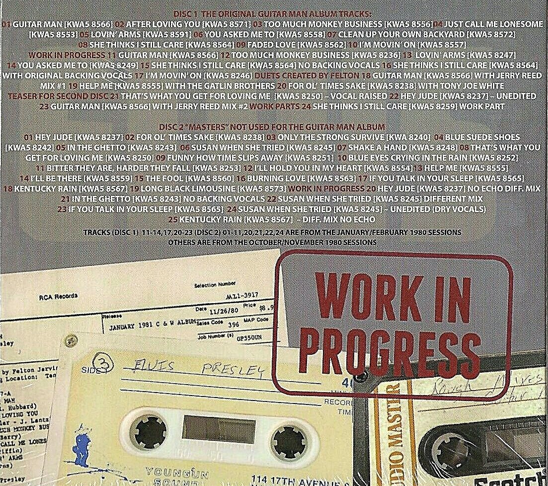 in 1980 Felton Jarvis, Elvis' record producer for the last decade came to the remarkable idea to freshen up some of Elvis' recordings. The idea was to add totally new backing tracks to Elvis' voice. This resulted in the 1981 record release of 'Guitar Man'. You hate it or you love it is probably the right thing to say about the album. Felton was convinced Elvis would have loved it. The original album contained 10 songs (which all can be heard in a wonderful newly remastered sound quality on this new 2 CD set). But Felton worked on a bunch of other songs to see if they would suit the project.